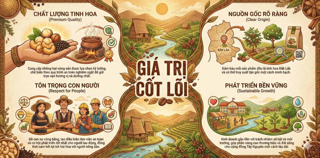 Foody Tây Nguyên là thương hiệu chuyên cung cấp các loại đặc sản khô Tây Nguyên, bao gồm mắc ca sấy, hạt điều sấy và hạt tiêu khô. Thương hiệu được thành lập vào năm 2025, với sứ mệnh trở thành cầu nối tin cậy, mang trọn vẹn hương vị của nông sản Đắk Lắk đến mọi nhà.